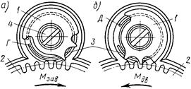 На рис. 3 показана конструкция храповика часового механизма. Вместо храпового колеса использовано обычное колесо с зубьями часового профиля. Это упростило конструкцию, так как сократилось число колес в механизме. Собачка 1 имеет несколько выступов и удерживается на оси винтом 4. На рис. 3, а показано положение собачки относительно колеса 2 при подзаводке часов. Момент М зав отводит собачку, которая одним из своих выступов непрерывно прижимается под действием пружины 3 к зубьям колеса 2, п ропуская их. Выступ собачки захватил конец Д пружины 3, деформируя последнюю. Конец Г пружины закреплен неподвижно. На рис. 3, б показано стопорящее положение собачки, когда она удерживает колесо 2. Зуб колеса упирается в один из выступов собачки. При переходе из положения а в положение б храповое колесо немного поворачивается, благодаря чему ослабляется напряжение заводной пружины после ее тугого завода. Это способствует увеличению срока службы заводной пружины и стало возможным благодаря применению собачки с несколькими выступами.
