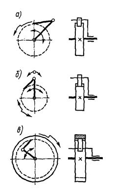 Кулисный механизм (рис. 6, а) наиболее часто применяют для преобразования вращательного движения кривошипа 1 в качательное движение кулисы 3. Камень кулисы 2 перемещается вдоль нее по направляющим. Кулисные механизмы могут быть использованы также для преобразования равномерного вращательного движения в неравномерное вращательное движение при а < r (рис. 6, б). Кулисы с камнем применяют также в тангенсных , синусных и других механизмах для замены высших кинематических пар низшими.