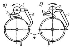 Храповые механизмы могут обеспечивать преобразование вращательного движения в колебательное или наоборот. На рис. 4 показана конструкция храпового механизма электрических часов, в которой толкающие собачки 1 и 3 преобразуют качания якоря 2 в прерывисто-вращательное движение храпового колеса 4. При движении якоря как в прямом, так и в противоположном направлениях собачки попеременно захватывают и толкают зубья храпового колеса (рис. 4, а, 6). На рис. 5 даны условные обозначения храповых механизмов для схем (ГОСТ 2.770—68): а — односторонний храповой механизм с наружным зацеплением; б — двусторонний храповой механизм с наружным зацеплением; в — односторонний храповой механизм с внутренним зацеплением.