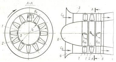 5 тель 6 снижает удары воздушного потока о лопатки; диффузор 5 преобразовывает динамический напор в статический. Для регулирования производительности и давления перед рабочим колесом устанавливают направляющий аппарат 7. Для раскручивания воздушного потока за рабочим колесом устанавливают спрямляющий аппарат 8, конструктивно представляющий собой неподвижное колесо с лопатками обтекаемой форм, устанавливаемыми под углом О са .