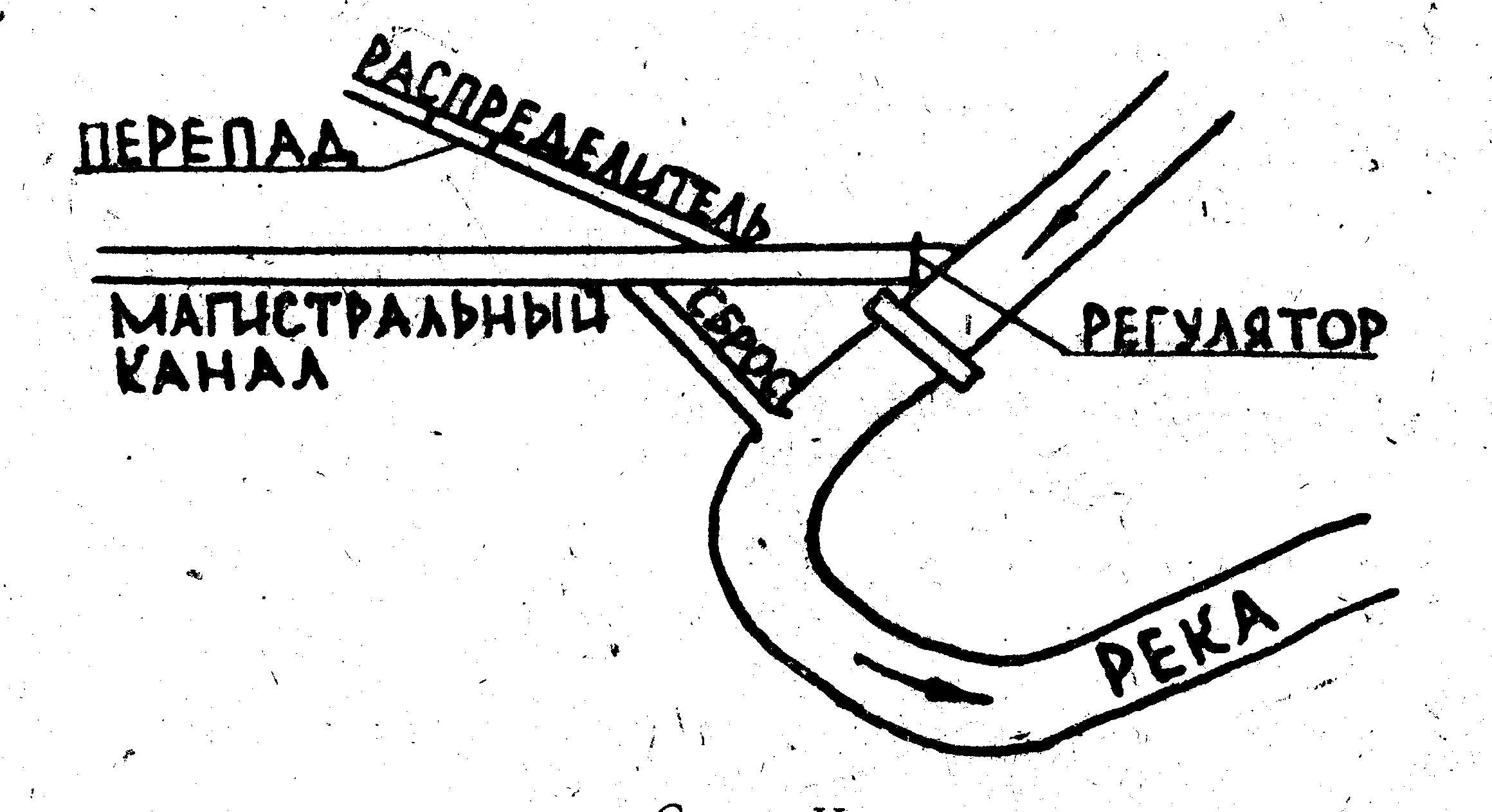 Магистральный канал подаёт воду на орошение и обводнение подкомандной ему территории. На магистральном канале устраивается распределительный узел. На сбросном канале, идущем от этого узла, устраивается перепад (схема I).