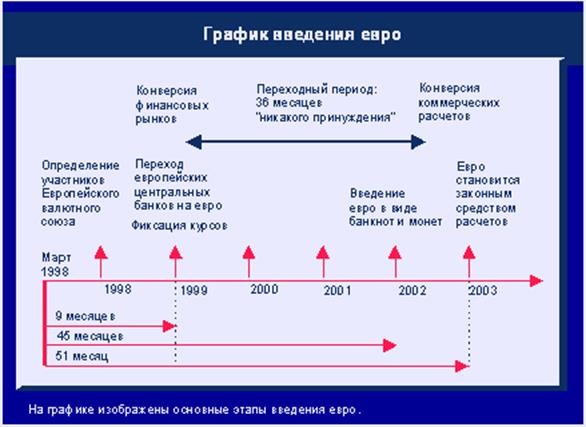 С 1 января 1999 г. в обращение в 11 странах - участницах соглашения введена евро . Расчеты производятся как в единой, так и в национальных валютах, однако финансовые транзакции и новые ценные бумаги оцениваются в евро.