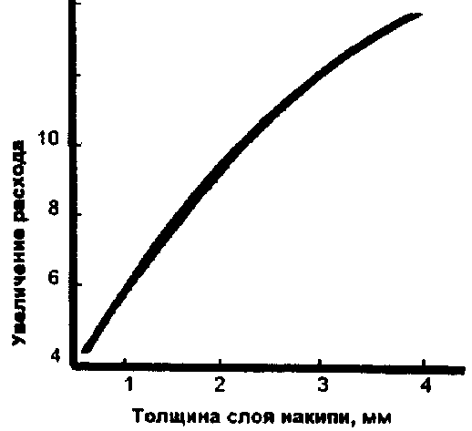 Образование накипи в системе охлаждения связано с выпадением из водного раствора солей кальция и магния, которые вместе с частичками примесей и продуктов коррозии «прикипают» к поверхностям нагретого металла.Слой накипи имеет очень малую теплопроводность, т.е. ухудшает теплоотвод. Одновременно уменьшается сечение трубок радиатора, что также ведет к перегреву двигателя и как следствие - к увеличению расхода топлива (рис.1).