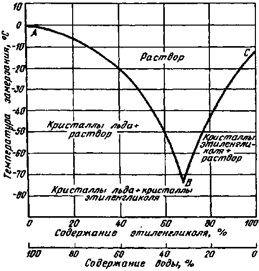 4. Этиленгликолъ - двухатомный спирт, представляет собой прозрачную бесцветную вязкую жидкость без запаха. Цвет технического этиленгликоля слегка желтоватый. При небольшой температуре застывания чистого этиленгликоля, его смеси с водой застывают при более низких температурах. Меняя соотношение воды и этиленгликоля, можно получить смеси с температурой застывания от 0 до минус 70°С (рис. 3).