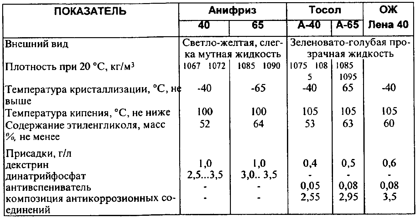 Химическая промышленность выпускает несколько марок антифризов на базе этиленгликоля (таблица 2). Первые низкозамерзающие охлаждающие жидкости - антифризы марок 40 и 65. Жидкость марки 40 представляет собой смесь 53 % этиленгликоля и 47% воды и имеет температуру замерзания не выше минус 40 °С. Жидкость марки 65 содержит 66 % этиленгликоля и 34% воды и имеет температуру замерзания не выше минус 65 °С.