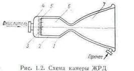 Рабочий процесс в камере ЖРД можно представить в следующем виде. Горючее и окислитель впрыскиваются под давлением в камеру сгорания через форсунки, дробятся на мелкие капли, перемешиваются, испаряются и воспламеняются. Воспламенение (зажигание) топлива может осуществляться химии ческими, пиротехническими и электрическими средствами (часто компоненты топлива являются самовоспламеняющимися).