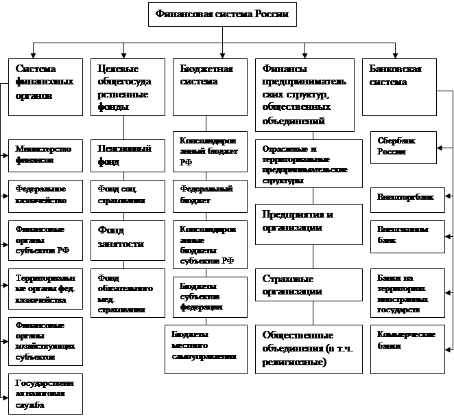 Большие изменения потерпела финансовая система. Сегодня в состав системы финансов входят бюджетная система, целевые государственные фонды, финансы отраслевых и территориальных органов управления, хозяйствующих субъектов, общественных организаций. Финансовая система в ее широком понимании включает в себя и кредитную систему. Центральным звеном которой являются банки. Структура финансовой системы, сложившейся в результате рыночных преобразований 90-х годов, представлена на схеме №1.
