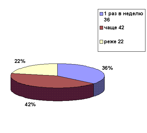 Покупают пиво 1 раз в неделю 36% респондентов, чаще, чем один раз в неделю 42% опрошенных, и 22% респондентов покупают пиво реже одного раза в неделю. Это видно из нижеследующей диаграммы.