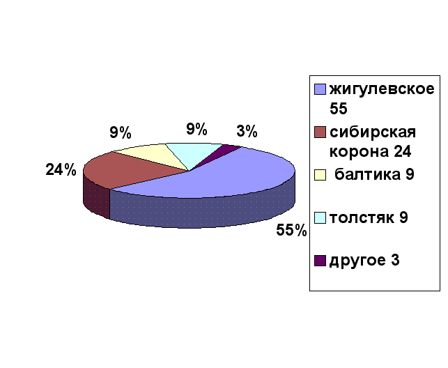 Из имеющегося на Курганском рынке ассортимента пива, наибольшим спросом пользуется «Жигулевское» Курганского пивзавода, которое предпочли 55% респондентов, 24% выбрали «Сибирскую корону» Омского производства. «Балтику» Санкт-Петербургской пивоваренной компании выбрали 9% респондентов, Саранскому пиву «Толстяк» отдали свои голоса тоже 9% опрошенных, и 3% человек выбрали другие сорта пива. Что видно из предоставленной диаграммы. В последние 3% входит также очень большой ассортимент пива, в основном это такая известная марка как «Очаково», чья продукция также представлена на нашем рынке различными сортами. Также различные сорта пива курганского пивзавода. Такой разброс по процентам вызван еще и тем, что респонденты отвечали в основном по сортам пива, предложенным в анкете (см. приложение №1).