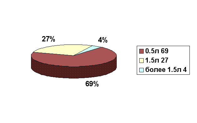 Исследования показали, что пиво приобретается в основном в стеклянной и пластиковой таре и в объеме 0.5 и 1.5 литра. Стеклянную посуду предпочли 60% респондентов, пластиковую 28%, и по 6% выбрали железные баночки (в которые в основном разливают пиво иностранные производители, также присутствует «Балтика» №4, №5) и на разлив. На разлив идет пиво курганского пивзавода рразличных сортов. Меньше чем пол-литра пива никто не покупает, 69% покупают пиво в объеме 0.5 литра, в 1.5 литровом объеме покупают 27% опрошенных, и более чем 1.5 литра выбрали 4% респондентов. Эти проценты видно из диаграммы.