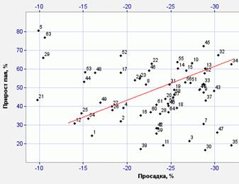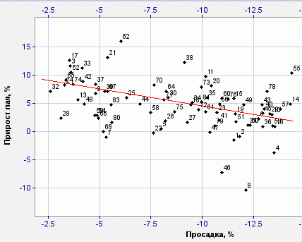 Построим график, на котором точки - это ПИФы, расположенные в соответствии с колебаниями доходности за выбранный период (1 год). По вертикальной оси отображено итоговое изменение (прирост или падение) цены пая за выбранный период. По горизонтальной - самое глубокое падение цены пая за выбранный период.