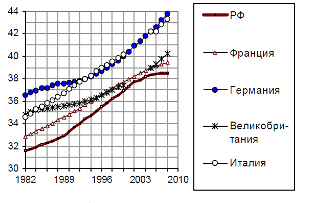 Население государства считается старым, если в его структуре доля людей в возрасте от 65 лет и старше превышает 7%. В России этот показатель равняется 12%. На одного пенсионера приходится всего 1,7 работающих. Население страны стареет, за период 1989 – 2007 гг. средний возраст россиянина вырос на 4,5 года, до 38,5 лет (рис. 1.1).