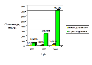 Позитивним зрушенням в останні роки є збільшення довгострокових депозитів, що дає комерційним банкам можливість збільшити обсяги довгострокового кредитування. Але такі депозити все ще займають невелику питому вагу в загальному обсязі вкладів. Також спостерігалося збільшення привабливості національної валюти для зберігання в ній частки доходів. Стабілізація політичної ситуації в Україні, підвищення довіри населення до дій уряду сприяли в четвертому кварталі 2004 року зростанню на 31,6% залишків депозитів та вкладів у національній валюті в комерційних банках. Однак, при збільшенні абсолютних розмірів вкладів з 29997 млн. грн. в 2003 році до 39475 млн. грн. в 2004 році, в цей період відбулося зниження частки вкладів населення з 49% до 43% в загальному обсязі коштів на рахунках юридичних і фізичних осіб, що пов`язано, скоріше за все, з передвиборною ситуацією в Україні в другому півріччі 2004 року.