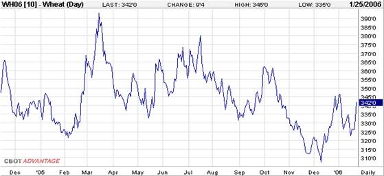 На рис. 1 приведен линейный график котировок на пшеницу с ценой деления 1 день. Как видно из графика выбранный масштаб позволяет охватить период времени, начиная с ноября 2004г. На графике одна точка означает один день, или, чтобы быть точнее, котировальную цену одного дня. Не будем забывать, что она содержит в себе ряд котировок, образовавшихся в течение данного дня (или, чтобы быть точнее – в течение торговой сессии данного дня). В то же самое время, в масштабе всего графика, котировальная цена одного дня сама становится котировкой для котировальной цены всего периода времени, отраженном на графике. Сделано это для того, чтобы не перегрузить график всеми имеющимися точками сделок и не сделать его зрительно не воспринимаемым. Иначе говоря, чем больший период времени мы хотим охватить для анализа, тем в большей степени мы должны усреднять имеющиеся совокупности цен сделок. На практике, обычно, применяются графики с ценой деления месяц, неделя, день. Графики с ценой деления больше месяца применяют крайне редко в случае необходимости проведения стратегических аналитических исследований в масштабах лет или десятилетий. Гораздо чаще практикуют анализ графиков внутри дня. Такие графики так и называются – внутридневные графики или интрадей-графики. Для интрадей-графиков применяют цену деления 1 час, 30 минут, 15 минут, 5 минут и, даже, 1 минута. Каждый аналитик выбирает тот период времени, который в наибольшей степени отвечает целям анализа. Например, одна из ведущих американских компаний, специализирующаяся на анализе биржевых рынков ElliottWaveInternational, считает, что для определения наиболее достоверной котировальной цены необходимо цену деления внутридневного графика принимать равной 1 секунде. Это значит, что в этом случае сделки заключаются, как минимум, каждую секунду. Можете представить себе такую активность участников торгов?