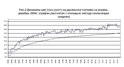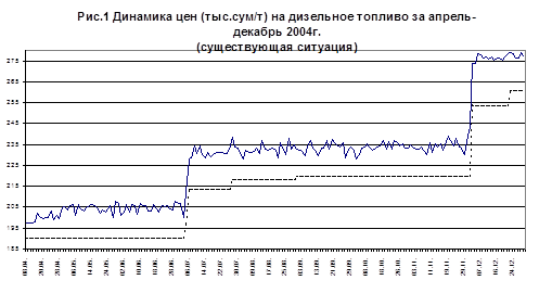 На рис.1 представлен график динамики цен (в тыс.сум/т) на дизельное топливо, реализуемое юридическим лицам на биржевых торгах УзРТСБ за апрель-декабрь 2004г. В основе графика лежат средние цены сделок одного торгового дня. «Стартовые» цены показаны пунктирной линией. Как видно из графика, с апреля до начала июля «стартовая» цена была определена административным решением на уровне 190 тыс.сум/т. Затем, таким же образом, «стартовая» цена была поднята до 213,48 тыс.сум/т и оставалась на этой отметке до 27 июля. Затем, с 28 июля до 28 августа, когда она вновь была поднята до отметки 218,1 тыс.сум/т. А с 29 августа «стартовая» цена была поднята до 220 тыс.сум/т. Этот уровень продержался до начала декабря, когда «стартовая цена» была поднята сначала до 253,5 тыс.сум/т, а с 23 декабря до 261 тыс.сум/т. Последний уровень сохранился до конца года. Особенно резкими на графике выглядят июльское и декабрьское изменения «стартовых» цен, и, соответственно, изменения среднедневных цен.