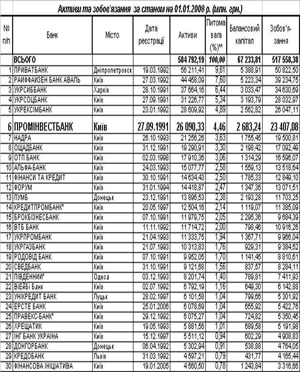 Таблиця 1.2. Групування банків на 2008 рік за розміром активів за станом на 01.01.2008 [19]