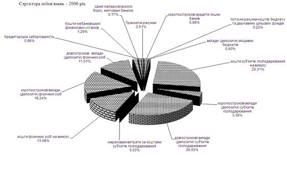 Зобов`язання банків мають таку структуру. Кошти Національного банку України складають 0,5% від загальної суми зобов’язань; коррахунки інших банків – 2,5%; строкові вклади (депозити) інших банків та кредити, що отримані від інших банків – 22,8%; кошти суб’єктів господарювання – 25,9%; кошти фізичних осіб – 35,7%; кошти небанківських фінансових установ – 2,5%; кошти бюджету та позабюджетних фондів – 0,6%; кредити, що отримані від міжнародних та інших фінансових організацій – 2,8%, цінні папери власного боргу – 2,1%; субординований борг – 1,6%; інші зобов`язання – 3,0%.