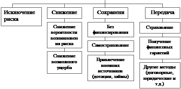 Процесс непосредственного воздействия на риск представлен на рисунке 3 в четырех основных способах: исключении, снижении, сохранении и передаче риска.