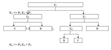 При классификации кредитов возможно использование модели CART(Classificationandregressiontrees), что переводится как «классификационные и регрессионные деревья». Это непараметрическая модель, основные достоинства которой заключаются в возможности широкого применения, доступности для понимания и легкости вычислений, хотя при построении применяются сложные статистические методы. В «классификационном дереве» фирмы-заемщики расположены на определенной «ветви» в зависимости от значений выбранных финансовых коэффициентов; далее идет «разветвление» каждой из них в зависимости от следующих коэффициентов. Точность классификации при использовании данной модели – около 90%. Пример «классификационного дерева» представлен на рис. 1.2, где Кi — финансовый коэффициент; Рi — нормативное значение показателя; В — предполагаемый банкрот; S— предположительно устойчивое состояние.