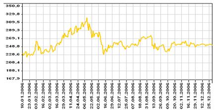 В течение всего года стоимость золота дважды достигала своего пика. Чтобы захватить их, вкладчик должен был вложиться в него первый раз в марте 2006 года, а продать золото уже в мае и получить 85% годовых. Второй раз можно было купить золото в середине июня по его полугодовому минимуму, а продать ровно через месяц, в июле. Это принесло бы еще 209% годовых. Таким образом, вложившись только в один металл и угадав всего два максимальных положительных тренда, можно было заработать до 294% годовых. До 57 и 24% годовых можно было заработать, вложившись в июле в палладий и в платину соответственно и продав металлы в сентябре.