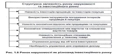 Найбільш поширена точка зору на ринок нерухомості як на різновид інвестиційного ринку. У зв'язку з цим прийнято виділяти загальні ідентифікаційні ознаки, що підтверджують наявність структурної залежності ринку нерухомості з інвестиційним ринком.