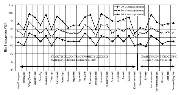 Рис. Д.1 - Основні прямі конкуренти (текстурно - сірі граніти) продукції Янцівського гранітного кар'єру(Запорізька область, Україна)