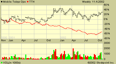 Несмотря на спад, наметившейся в телекоммуникационном секторе США в 2000-2002 гг., акции МТС выросли по сравнению с ценой выхода на биржу на 20%, в то время как корзина Telecom HOLDRs банка упала на 50%. Это красноречиво свидетельствует об интересе западных инвесторов к российским компаниям.