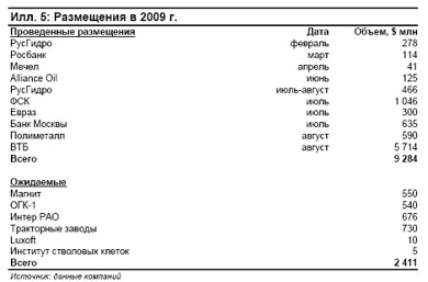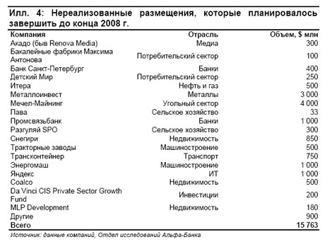 С тех пор только две компании осуществили первичные размещения, однако сделали это не на российских площадках, а в Европе. В 2008 г. размещение в Лондоне провела компания GlobalTrans, в ходе которого привлекла около 450 млн долл. А в этом году в июне на Шведской бирже компания Alliance Oil разместила SDR на 125 млн долл. В результате отказа компаний от IPO отложенный объем размещений с 2008 г. (по оценкам того же года) составил почти 16 млрд. долл. С учетом планируемых размещений на 2009-2010 гг. размер отложенных/отмененных размещений увеличивается до 52 млрд. долл.