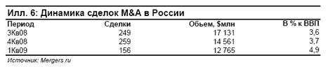 Удешевление бизнеса конкурентов - международных компаний, - вызвало желание российских корпораций закрепиться на мировой арене. Этому способствовало государство, предоставившее в распоряжение покупателей значительные кредитные средства. Крупнейшими сделками стали покупка "Газпром нефтью" компании Sibir Energy за 962 млн долл., приобретение "Лукойлом" нефтеперерабатывающего завода в Голландии за 600 млн долл., и реализация "Газпромом" опциона на выкуп 20% "Газпром нефти" у итальянской Eni 20% за 4,2 миллиарда долларов. В августе 2009 авиакомпания "ЮТэйр" завершила сделку по приобретению перуанской группы вертолётных компаний. Продолжаются переговоры по покупке ГАЗом и Сбербанком компании Opel.