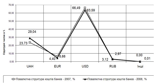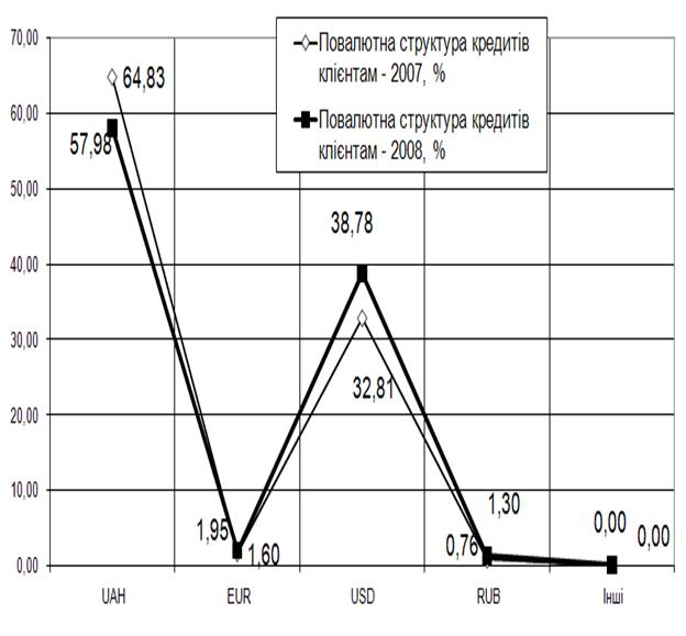 Рис.Л.11. – Повалютна структура наданих міжбанківських кредитів в кредитному портфелі ЗАТ КБ «Приватбанк» у 2007 - 2008 роках