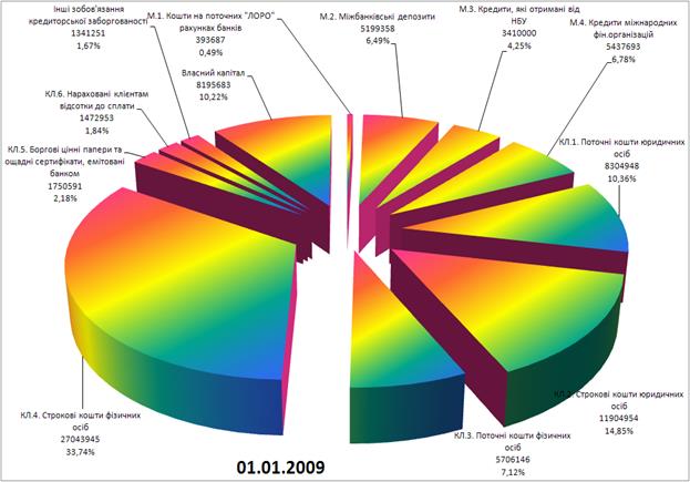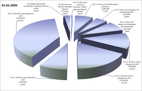 Рис. К.3. – Динаміка змін структури фінансових джерел (пасивів) операцій ЗАТ КБ «Приватбанк» у кінці 2008 – початку 2009 роках (кризовий період)