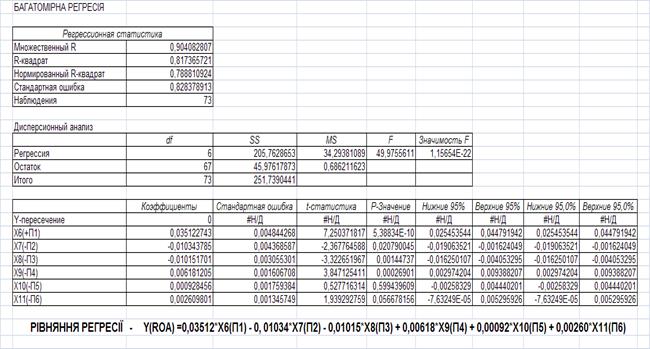 - побудована економетрична 6-ти параметрична багатомірна регресійна модель впливу структури власних, залучених та запозичених джерел в ресурсній базі банку на рівень рентабельності діяльності банку.