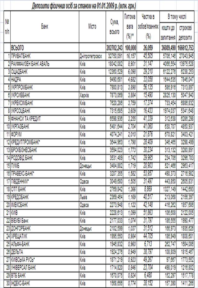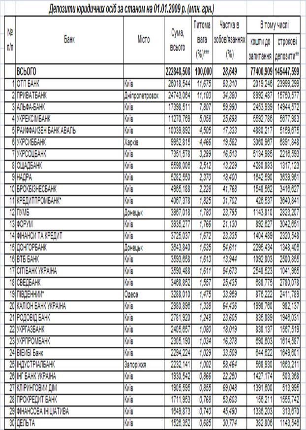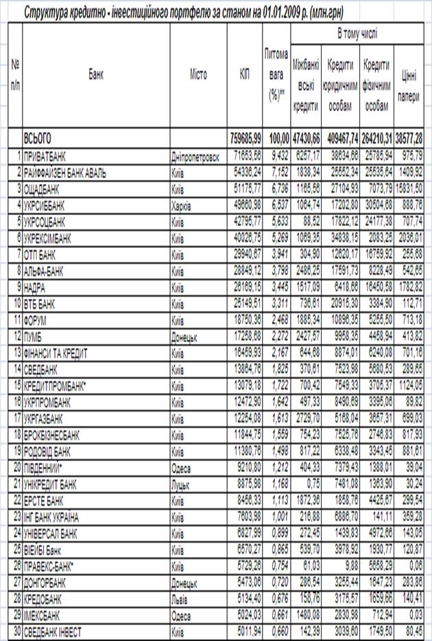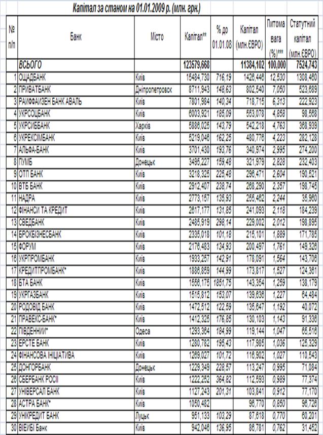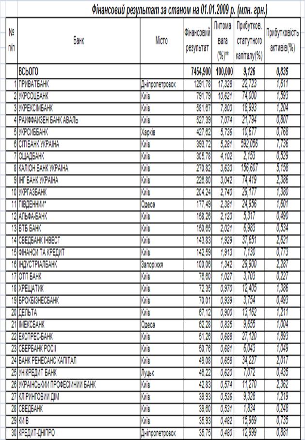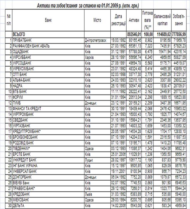 Показники діяльності перших 30 банків БС України станом на 01.01.2009 року за даними Асоціації банків України