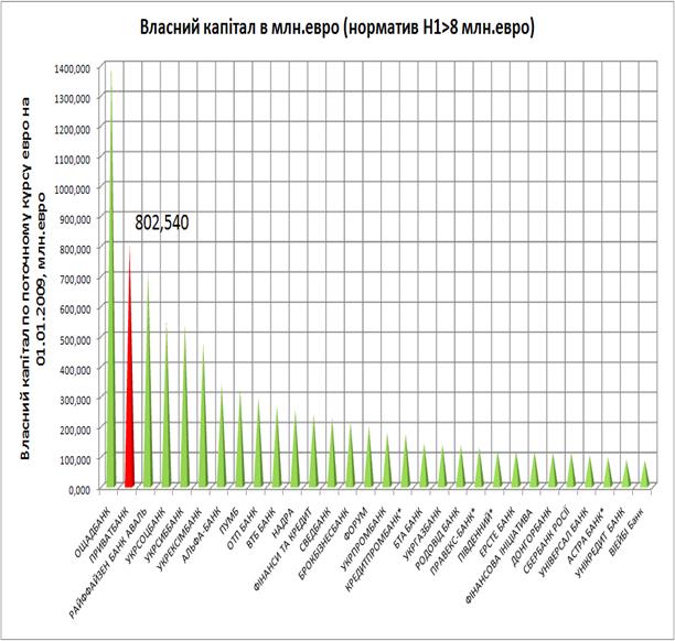 Рис.Е.4. – Рейтинговий рівень обсягів власного капіталу ЗАТ КБ «Приватбанк» в банківській системі України станом на 01.01.2009 року (результат 2008 року)