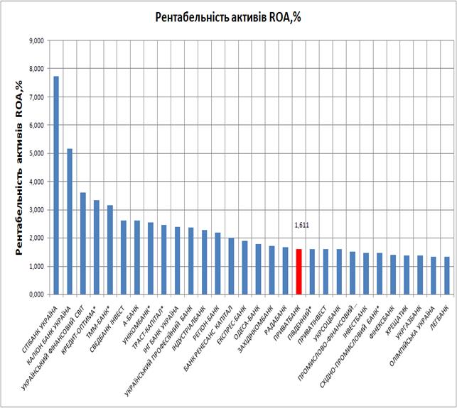 Рис.Е.8. – Рейтинговий рівень рентабельності активів ROA ЗАТ КБ «Приватбанк» в банківській системі України станом на 01.01.2009 року (фін.результат 2008 року)