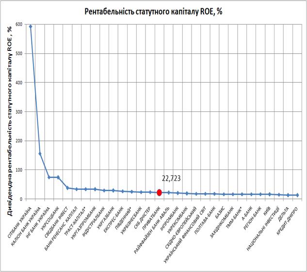 б) при частці власного капіталу в пасивах – 12,39% для дослідженого банку «Приватбанк»(1 місце на ринку залучених коштів по обсягу), рівень рентабельності статутного капіталу становить 22,66%;