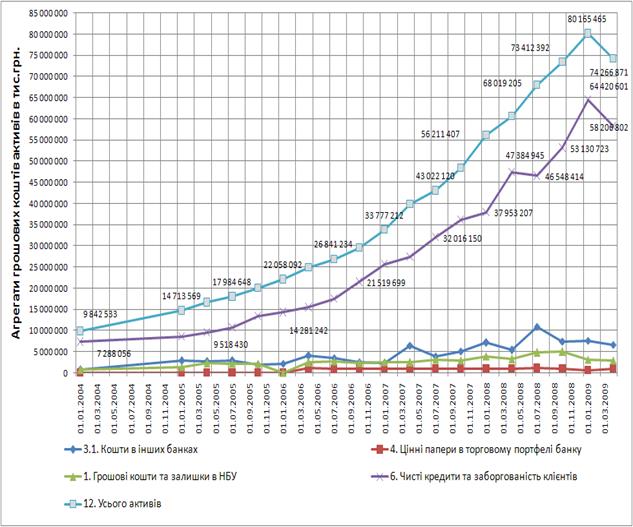 Рис. Ж.1 – Динаміка росту абсолютних рівнів агрегатів активів балансу ЗАТ КБ «Приватбанк» у 2003 -2009 роках