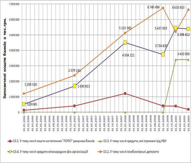 Рис. Ж.2. – Динаміка росту абсолютних рівнів запозичених міжбанківських коштів в агрегатах пасивів балансу ЗАТ КБ «Приватбанк» у 2005 - 2009 роках(передкризова та кризова динаміка)