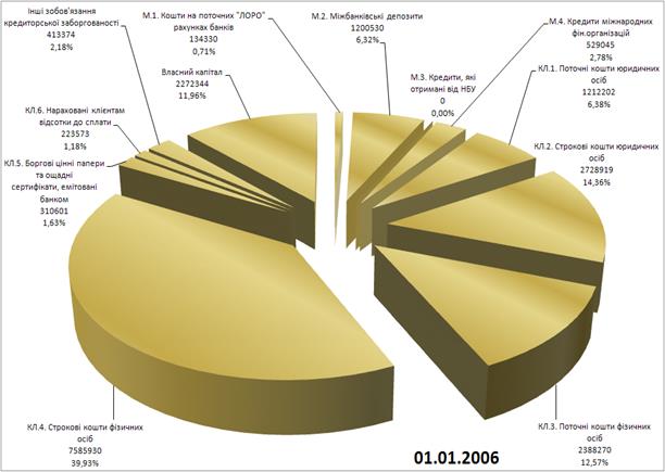 Рис. К.1. – Динаміка змін структури фінансових джерел (пасивів) операцій ЗАТ КБ «Приватбанк» у 2005 - 2006 роках