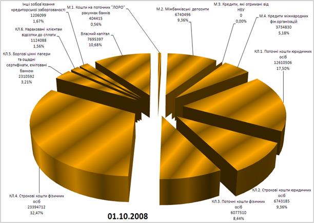 Рис. К.2. – Динаміка змін структури фінансових джерел (пасивів) операцій ЗАТ КБ «Приватбанк» у 2007 - 2008 роках (докризовий період)