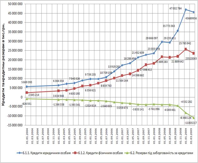 Рис. Л.1 – Динаміка росту абсолютних рівнів кредитів юридичним і фізичним особам та резервів на кредитні ризики в ЗАТ КБ «Приватбанк» у 2003 -2008 роках