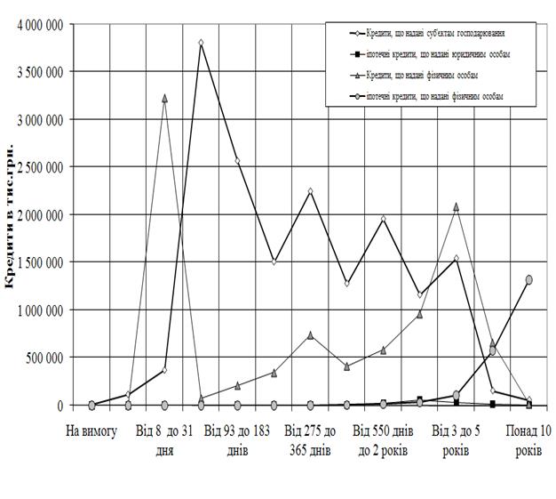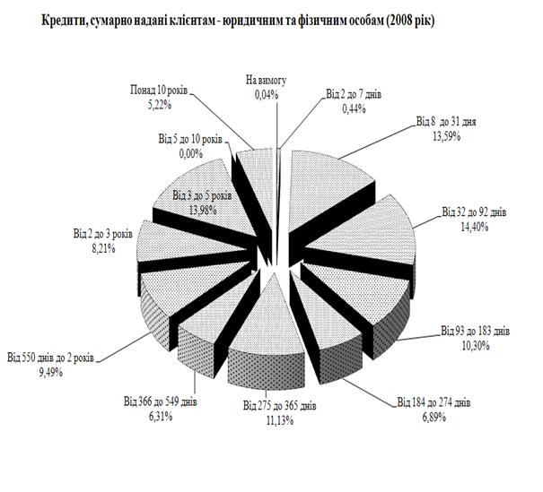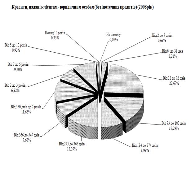 Рис.Л.7 – Структура строковості сум наданих кредитів юридичним та фізичним особам в кредитному портфелі ЗАТ КБ «Приватбанк» у 2008 році