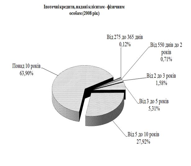 Рис. Л.5 – Структура строковості наданих іпотечних кредитів фізичним особам в кредитному портфелі ЗАТ КБ «Приватбанк» у 2008 році