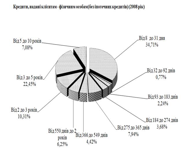 Рис. Л.6. – Структура строковості наданих кредитів(крім іпотечних) фізичним особам в кредитному портфелі ЗАТ КБ «Приватбанк» у 2008 році
