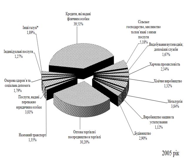 Рис. Л.8 – Галузева структура наданих кредитів юридичним та фізичним особам в кредитному портфелі ЗАТ КБ «Приватбанк» у 2005 році