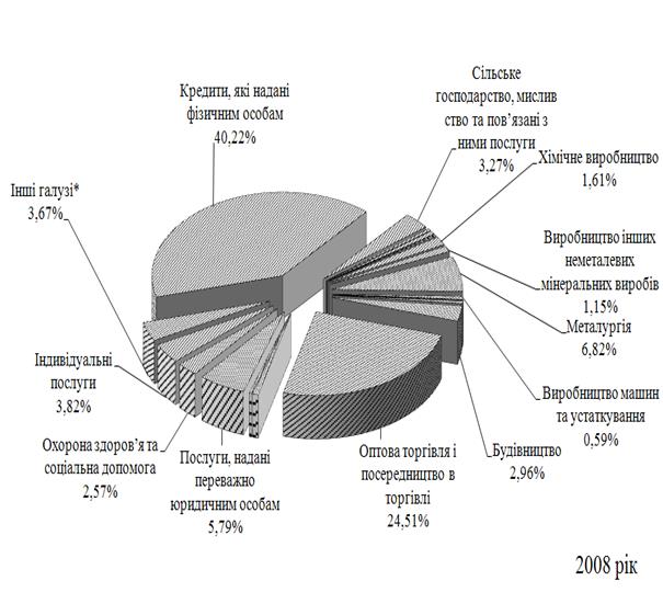 Рис. Л.9 – Галузева структура наданих кредитів юридичним та фізичним особам в кредитному портфелі ЗАТ КБ «Приватбанк» у 2008 році