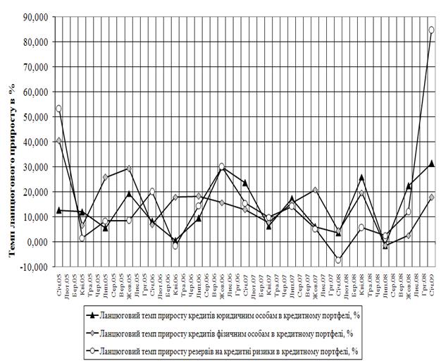 Рис. М.1 – Динаміка ланцюгових темпів росту кредитів та резервів на кредитні ризики в кредитному портфелі ЗАТ КБ «Приватбанк» у 2003 -2008 роках