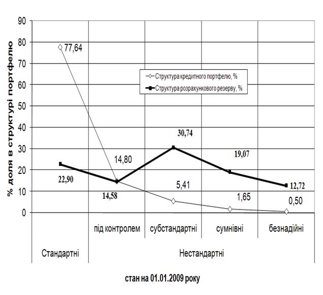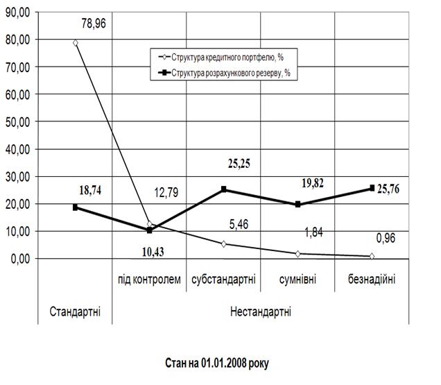 Рис. М.4 – Структура кредитів в кредитному портфелі та структура створених обсягів резервів під кредитні ризики в ЗАТ КБ «Приватбанк» у 2008 році