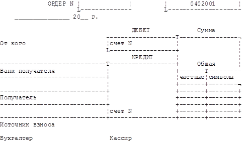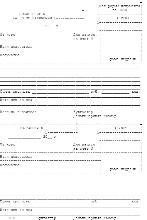 Прием денежной наличности от организаций в приходную кассу производится по объявлениям на взнос наличными 0402001, представляющим собой комплект документов, состоящий из объявления, ордера и квитанции .