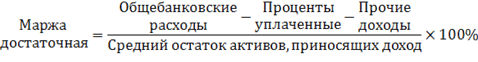 При определении доходности кредитного портфеля выделяют ее нижнюю и верхнюю границы: нижняя граница доходности определяется как сумма себестоимости кредитных операций (затраты на персонал, ведение ссудных счетов), величины процента, подлежащего уплате за вложенные в кредитный портфель ресурсы; верхней границей является уровень достаточной маржи, которая рассчитывается по следующей формуле: